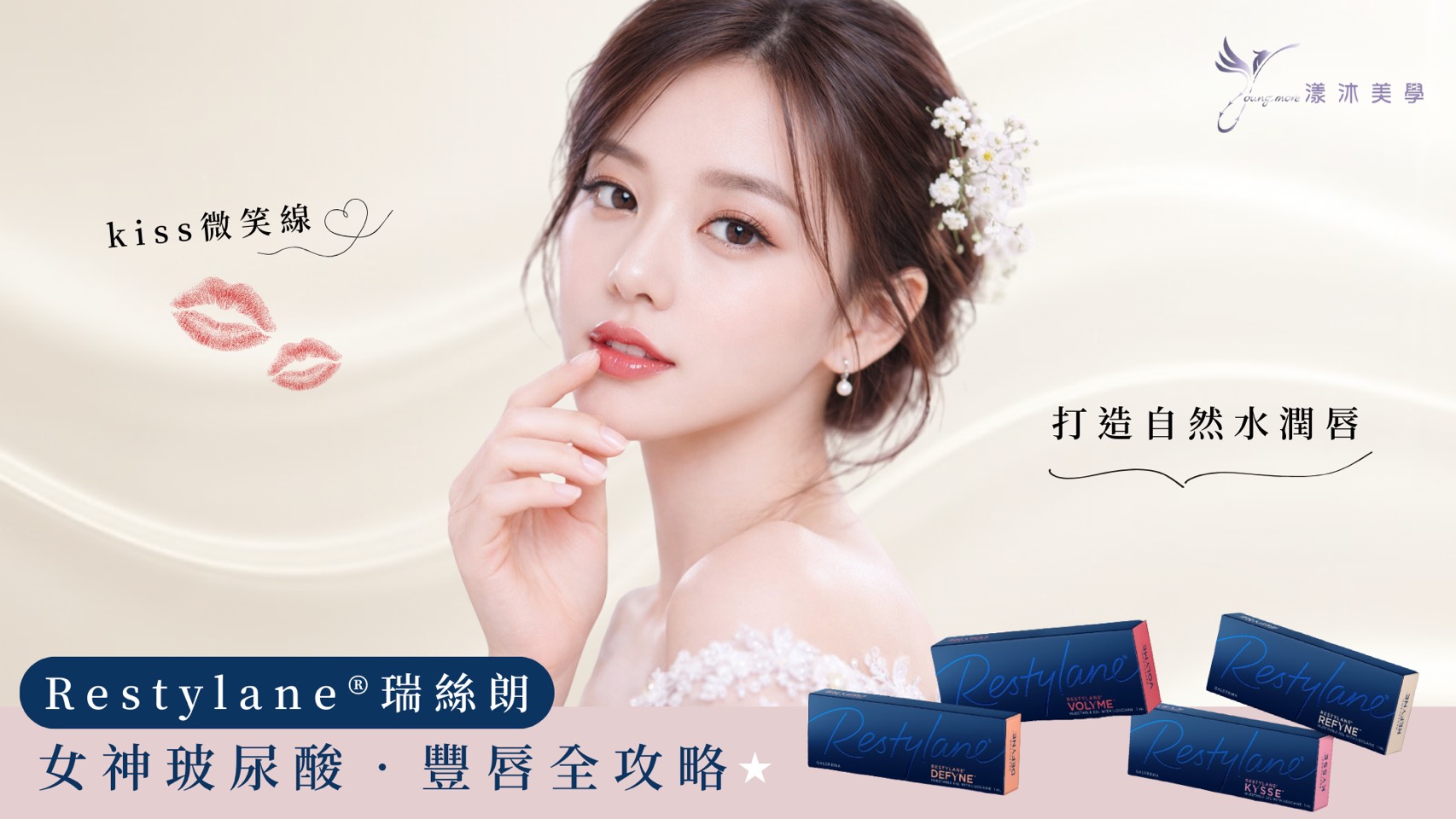 漾沐美學選用的Kysse玻尿酸,是專為唇部設計的動態型玻尿酸,擁有專利的Optimal Balance Technology動態平衡優化技術,能隨著表情變化保持自然延展與彈性,讓妳在微笑、說話、自拍時都不僵硬,且維持時間可達9~12個月,比一般唇用玻尿酸更長效。
