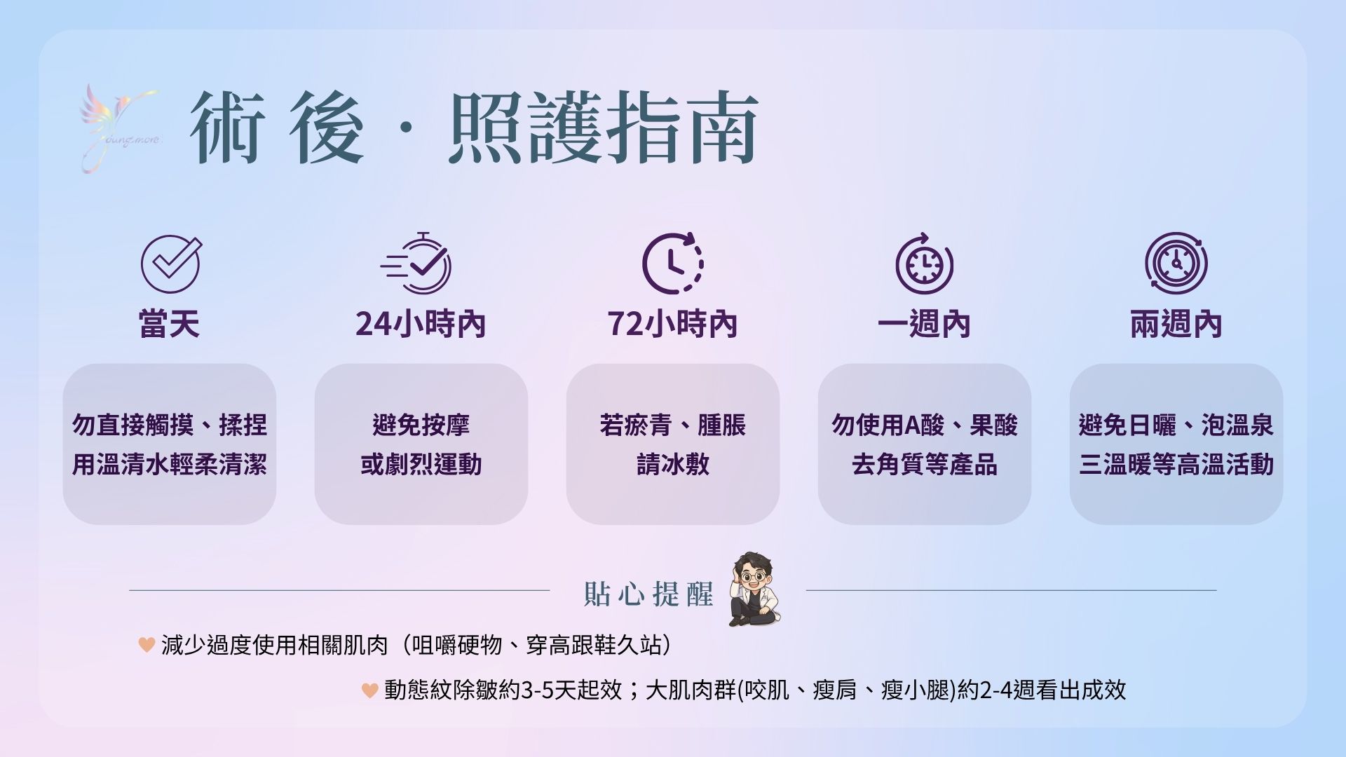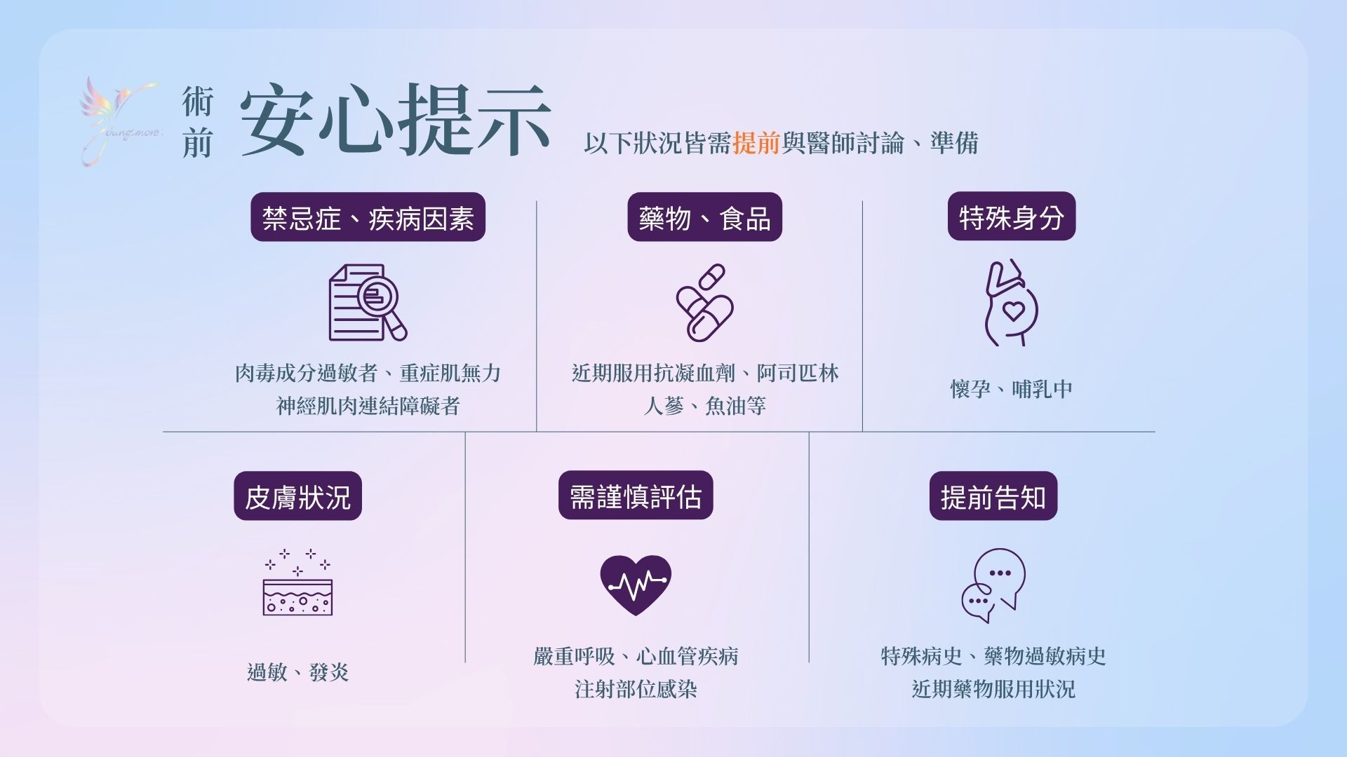 肉毒桿菌素療程適合多種美容及生理需求的患者,能針對不同部位問題提供改善方案。對於因咀嚼肌過度發達而臉型偏方的人,肉毒桿菌素能有效放鬆肌肉,使臉部線條變得更柔和小巧;對希望改善皺紋的患者,無論是魚尾紋、皺眉紋還是抬頭紋,肉毒桿菌素能針對動態皺紋達到平滑效果。對於靜態皺紋,則可配合其他填充療法,提升面部的緊緻度。此外,肉毒桿菌素也能有效改善嘴角下垂和八字眉問題,讓面部表情更自然、生動。針對小腿肌肉發達者,肉毒桿菌素能減少肌肉活動,使腿部線條更加修長。而對肩膀過於壯碩或斜方肌過度發達的人,注射後可舒緩肌肉緊繃,改善肩頸痠痛的同時,優化肩膀線條。最後,對於腋下多汗症困擾者,肉毒桿菌素能有效抑制汗腺活動,顯著減少排汗問題。