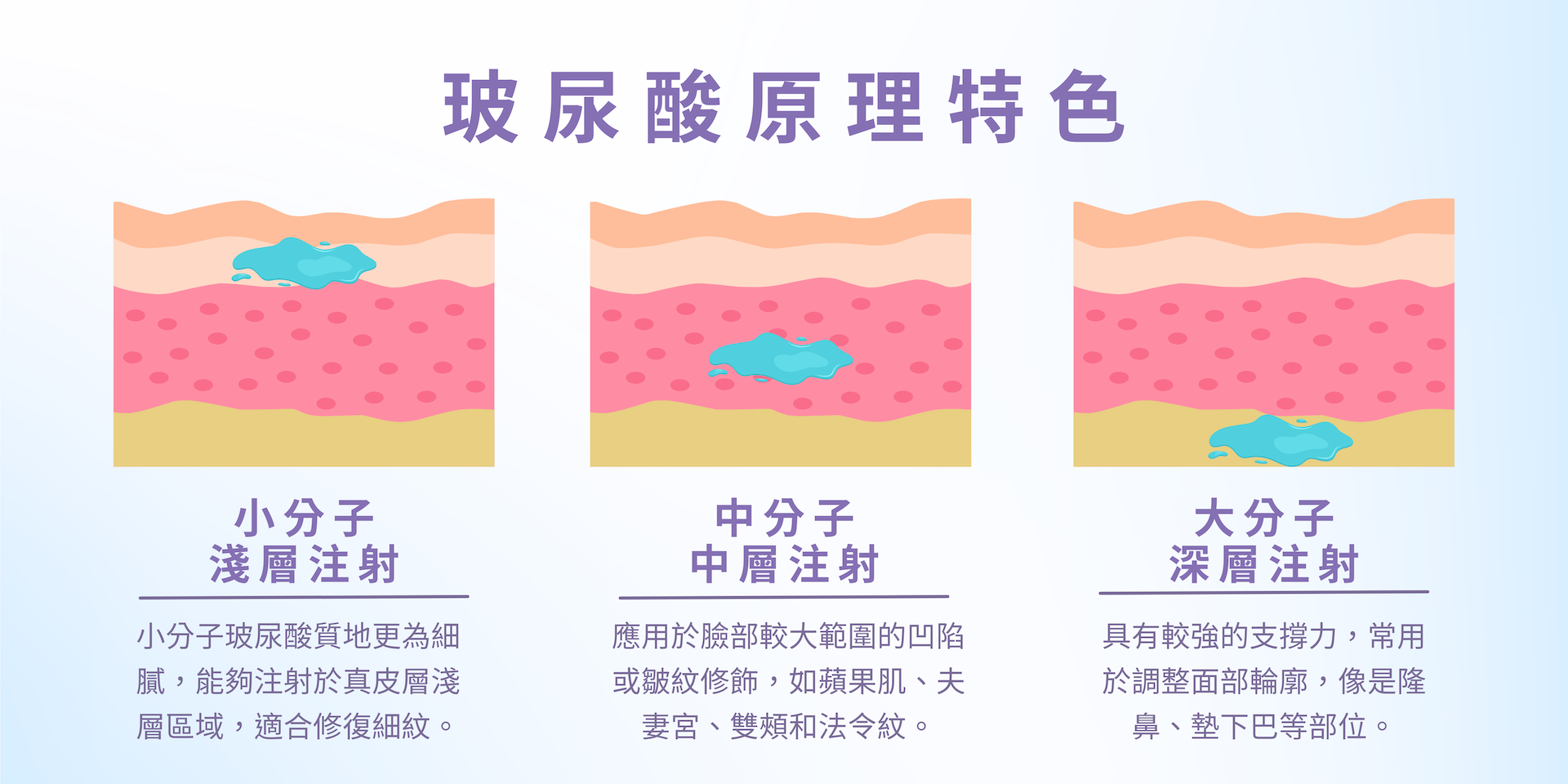 中分子玻尿酸相較於大分子更加柔軟,但仍具有良好的支撐力,適合於真皮中層或深層區域填補,應用於臉部較大範圍的凹陷或皺紋修飾,如蘋果肌、夫妻宮、雙頰和法令紋。它的效果能維持6至9個月,有效改善臉部整體輪廓與膚質狀況。