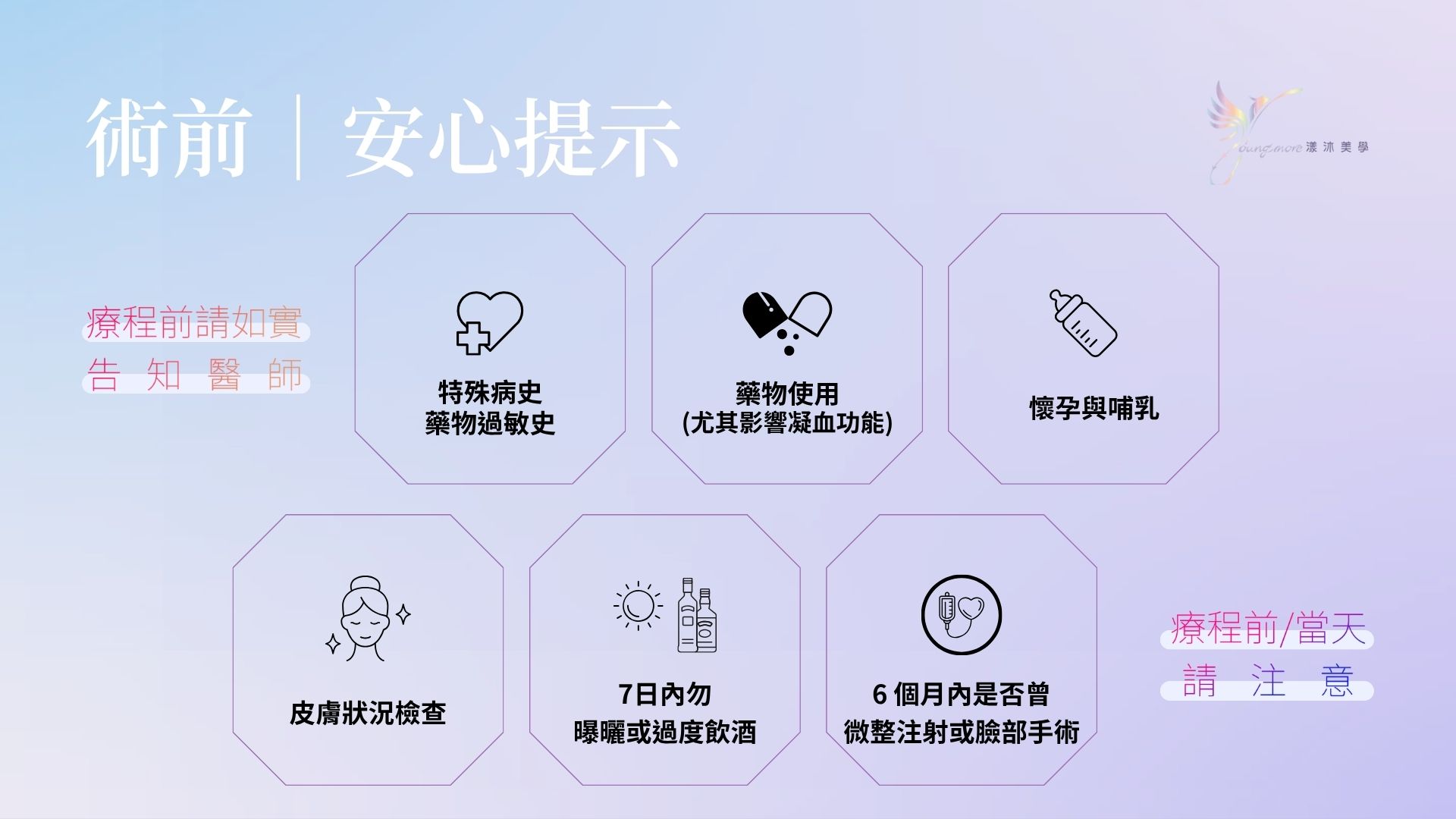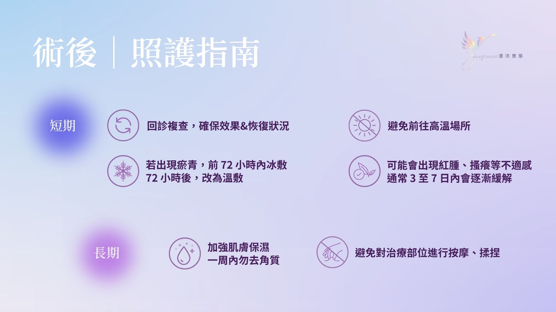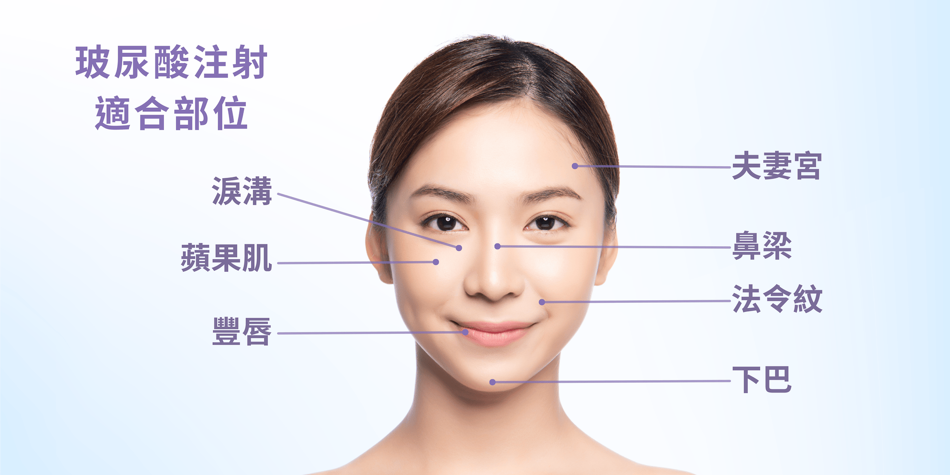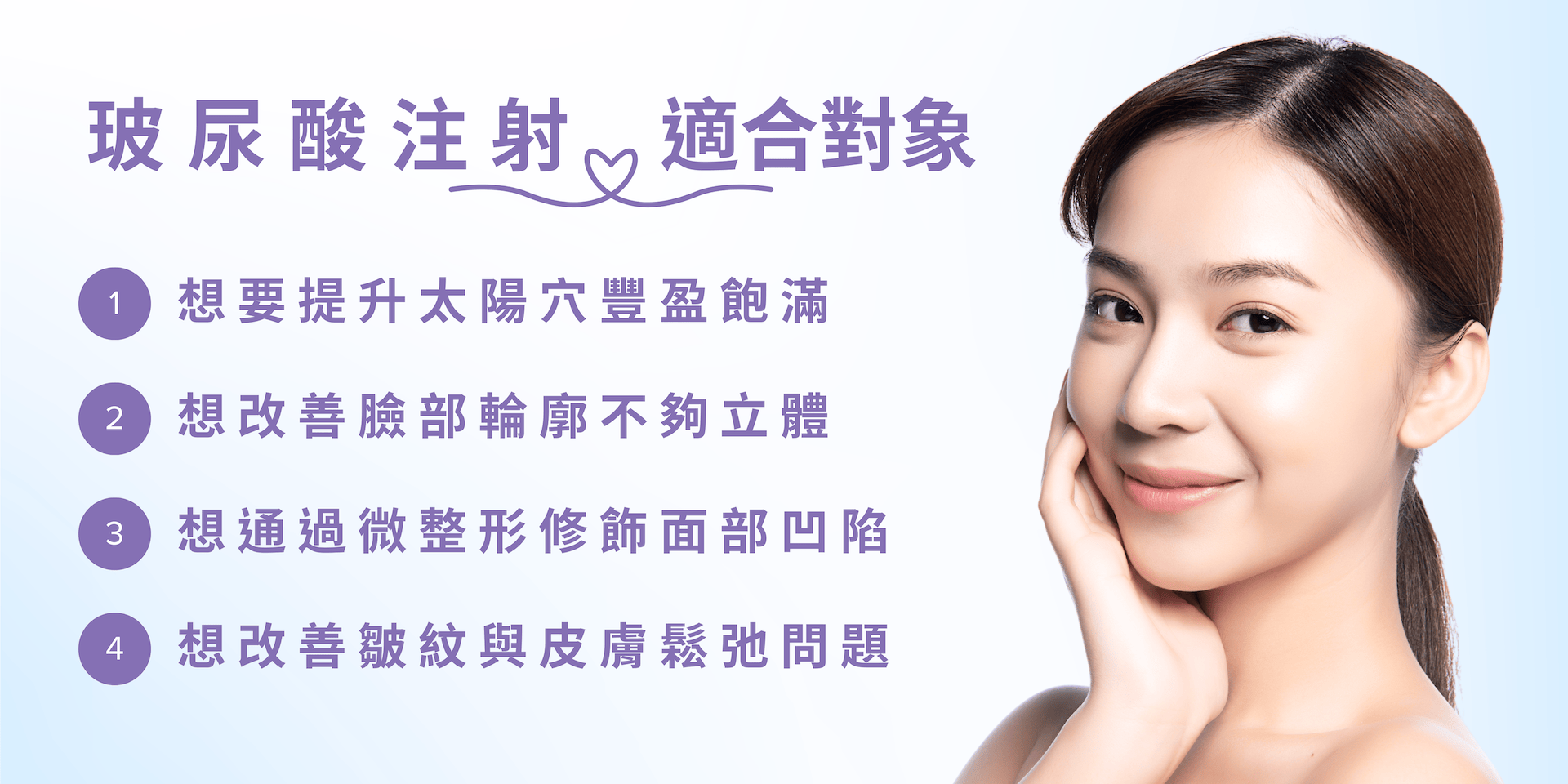 玻尿酸療程適合有凹陷紋路、臉形雕塑需求的患者,特別能有效改善淚溝、眼窩凹陷、抬頭紋、眉間紋、笑紋及口周細紋等靜態皺紋。對於面部形態雕塑者,療程可修飾鼻型、豐頰、豐太陽穴,甚至修飾下巴、眉骨與耳型不對稱問題,幫助恢復臉部線條平衡。此外,豐唇與唇線雕塑也是療程亮點,可使唇部輪廓更加明顯立體,達到飽滿的效果。對於凹陷型疤痕,如水痘疤痕等,也能提供有效的填補修復。不論是老化引起的皺紋、臉部凹陷,還是乾燥皮膚,都可透過此療程獲得顯著改善,不僅能夠恢復皮膚的彈性與保水度,還可讓臉部輪廓更加立體達與自然。