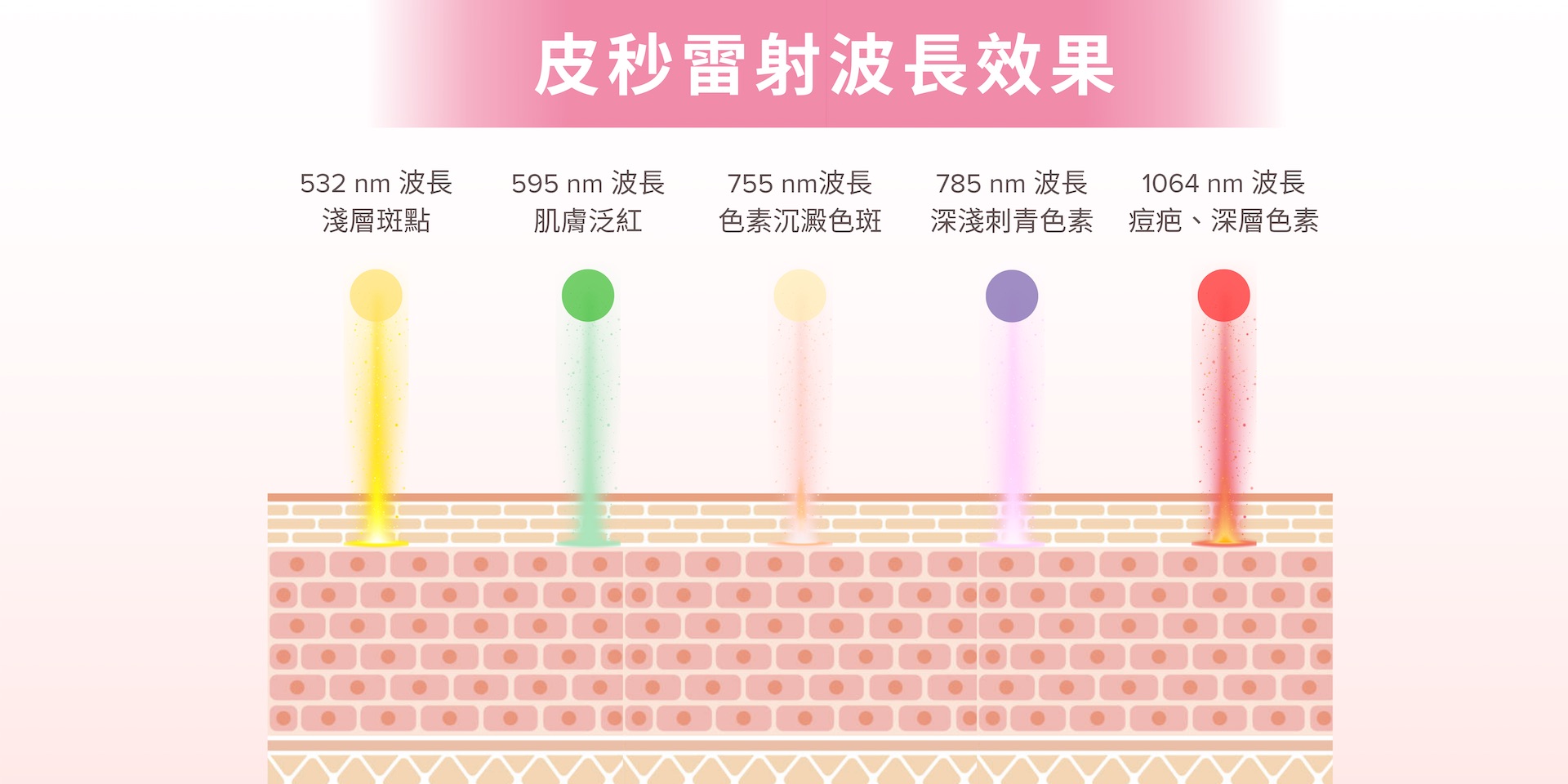 波長 1064 nm 具有深層穿透能力,針對肌膚底層的色素沉澱及深層疤痕問題。這個波長能有效淡化痘疤、凹疤及頑固色素沉澱等深層問題,讓肌膚平滑和均勻膚色。