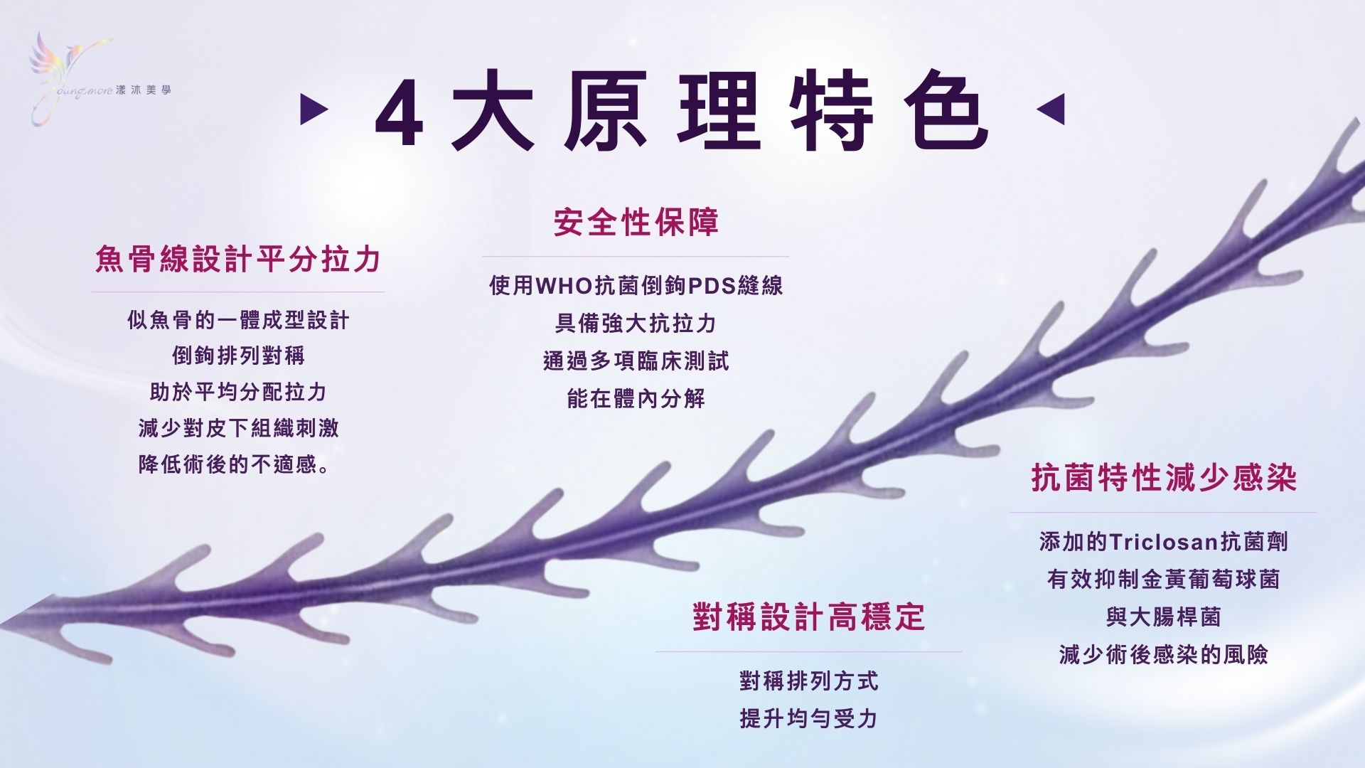 藍鑽魚骨線具有抗菌特性,其添加的Triclosan抗菌劑能有效抑制金黃葡萄球菌與大腸桿菌,從而減少術後感染的風險。這種線材的拉力強韌,適合用於多種提升需求,並且能夠長時間維持提升效果。